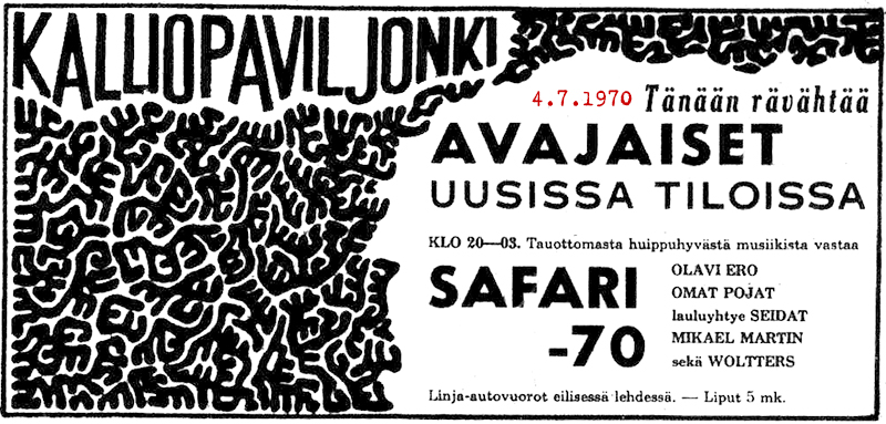 - 4.7. Safari -70: Olavi Ero, Omat pojat, lauluyhtye Seidat, Mikael Martin, Woltters