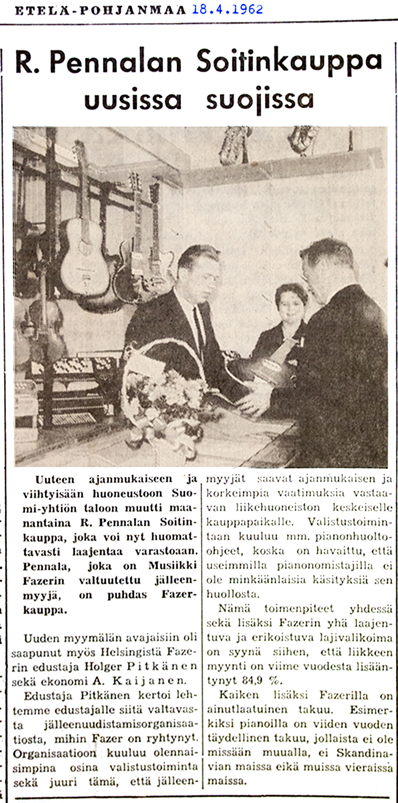 Raimo Pennala aloitti soitinkaupan Puskantiellä loppuvuodesta 1960. Siitä se muutti Kauppakatu 19 osoitteeseen. Avajaiset olivat 16.4.1962.