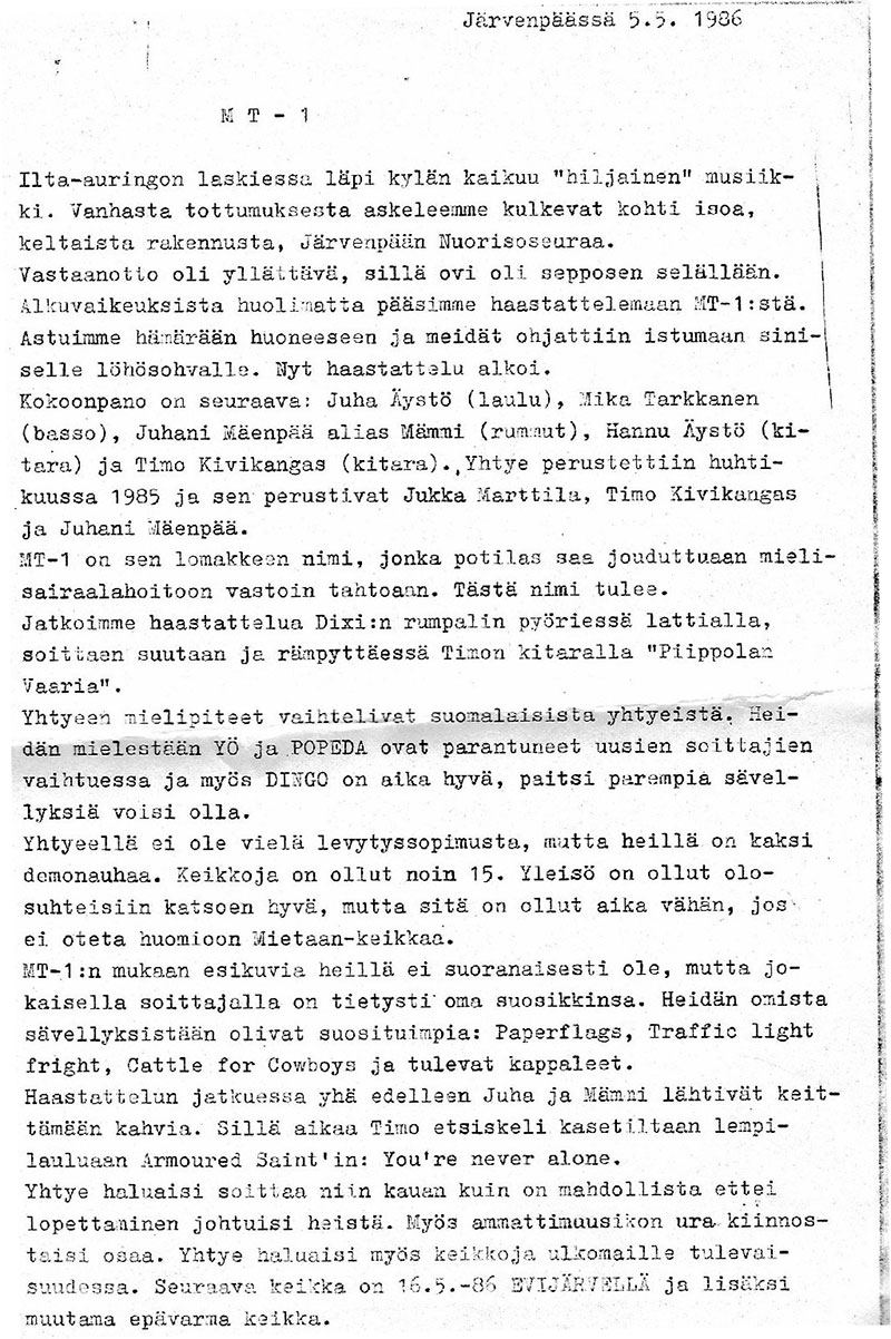 Koululaisten tekemä MT-1 haastattelu Jurvan yläasteen lehdessä 1986