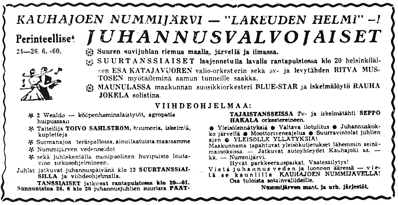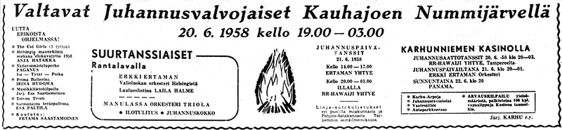 - 25.6. Reijo Järvenpää, Esa Karin orkesteri solisteina Juhani Markola, Raila, Hilkka ja Seppo
