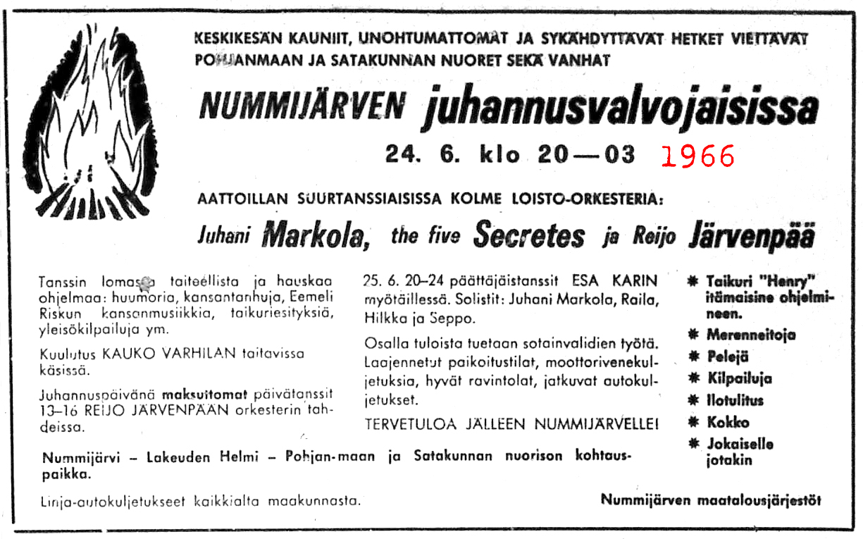 - 24.6. Juhani Markola, The Five Secretes, Reijo Järvenpää, Eemeli Riskun kansanmusiikkia