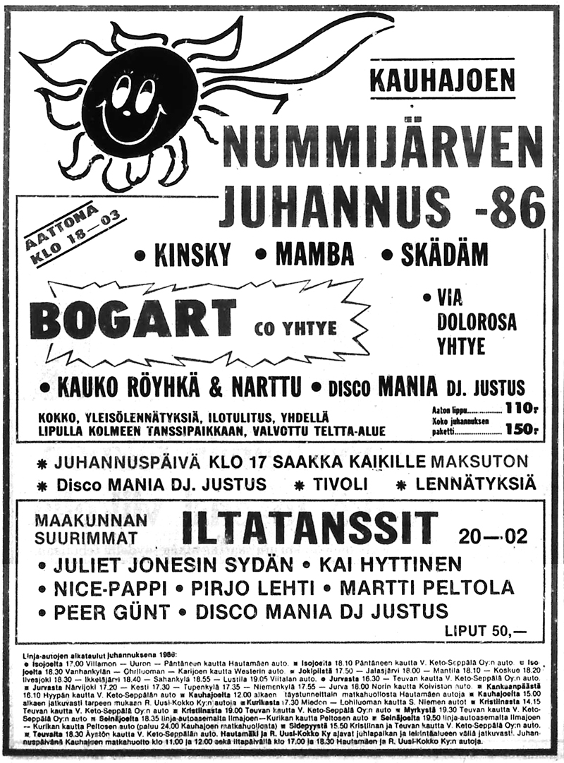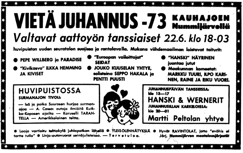 - 26.6. Juhani Kotajärvi yhtyeineen, Berit, Musta Rudolf ja Jussi Roponen