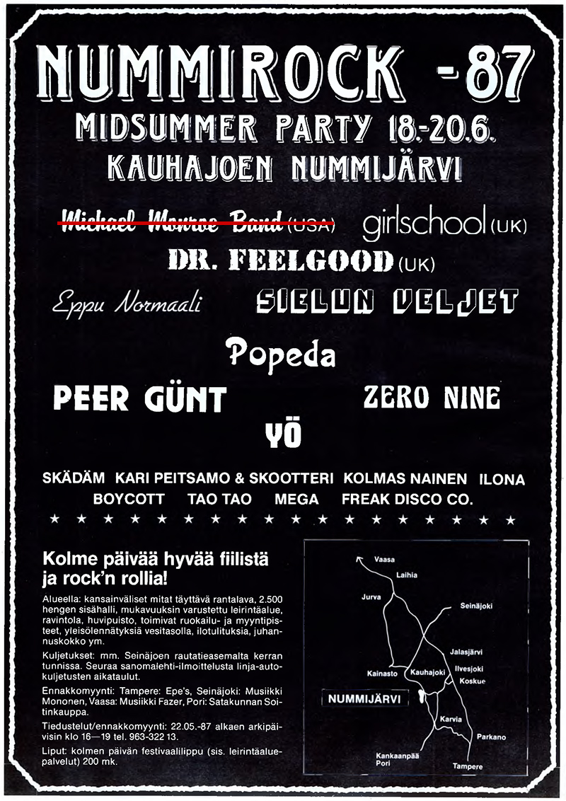 - 19.6. (Hanoi Rocks peruuntui), Ratsia, Pelle Miljoona, The Cruisers (UK), Suosikki Super Show - Miss Farkku Suomi, Jyrki Hämäläinen, Katri Helena, Juhani Markola ja Herttuat, Reijo Kallio ja Iltatähti