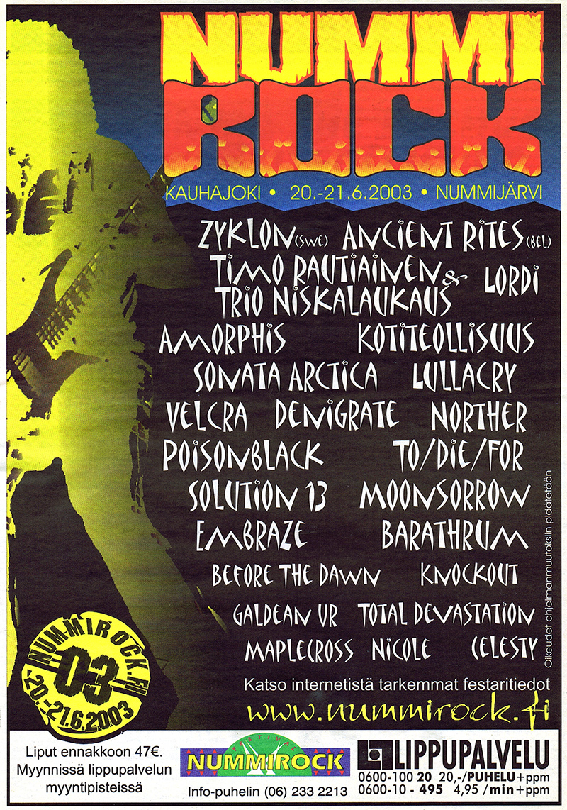 - Scorpions (GER), Danzig (USA), Motörhead (UK), Dismember (SWE), Hammerfall (SWE), Impaled Nazarene, Stratovarius, Amorphis, Waltari, Sentenced, Children of Bodom, CMX, Don Huonot, Yö, Klamydia, Nightwish, Ne Luumäet, Ultra Bra, 69 Eyes, Embraze, 3 Some, Jaarli Padington, Rasmus, Fairytale, Rotten Sound, Obsession, Babylon Whores, Am I Blood, Five Fifteen, Jimsonweed, Lehtivihreät, Tarrakuva, Tyrävyö Feat. Jimi Pääkallo, Fake, No Way, James The Beaver, Nollaseiska, Lullacry, Silent Voices, Fateful Gardiac, G.G. Spirit, Aktio, Cartoon Tree, Athmosfear, Seven Down, Fultrack, Otos-77, Me Wise Magic, Once A Weekers, Twilight Guardians, Murder Im Art, Arbor Vitae, Black Bay, RMS, Earthquake, Suspicios Motha, Alvarn